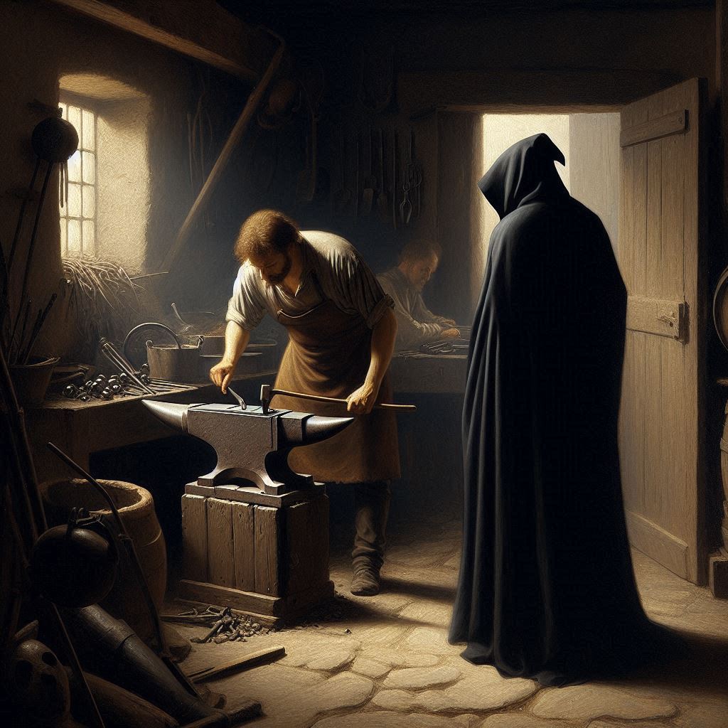 A Morte estava sentada em um banco em uma posição relaxada e olhando para o interior da oficina, de alguma forma visivelmente tensa. O capuz oval escuro virou-se lentamente em direção ao ferreiro.